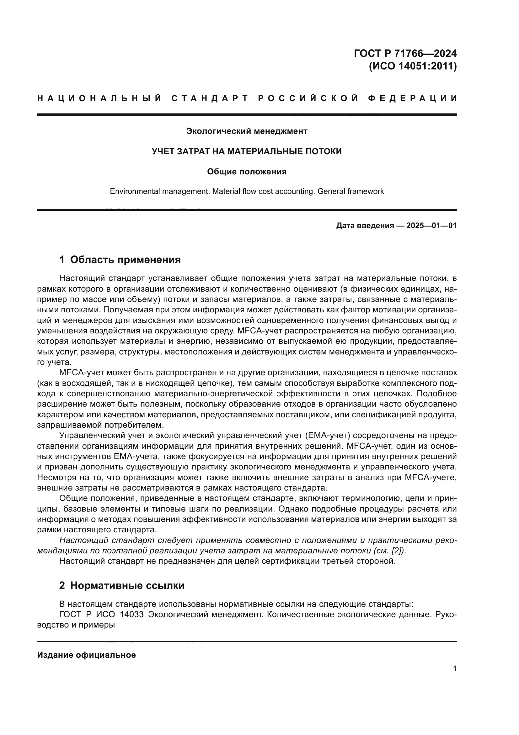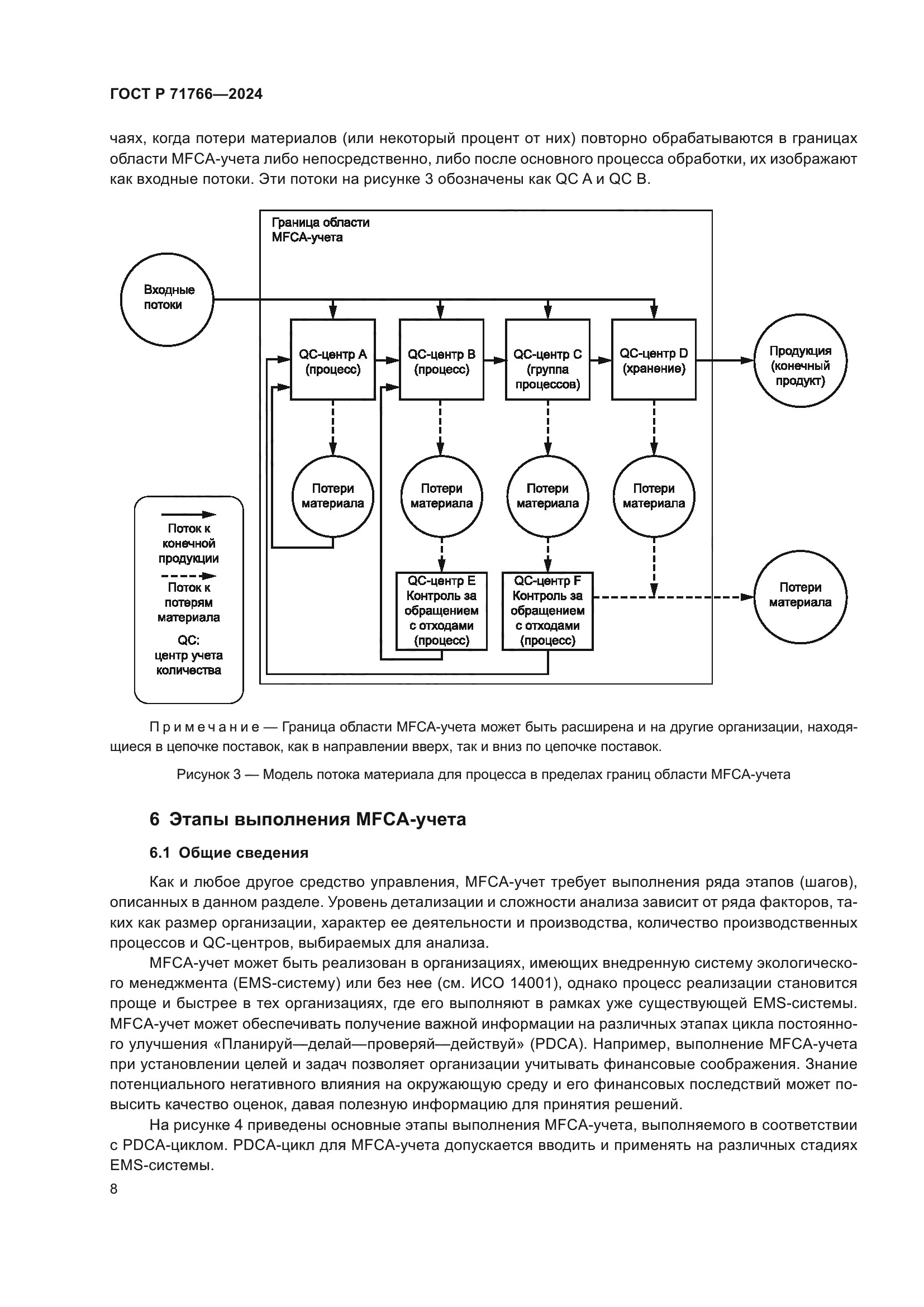 Область применения: | Настоящий стандарт устанавливает общие положения учета затрат на материальные потоки, в рамках которого в организации отслеживают и количественно оценивают (в физических единицах, например, по массе или объему) потоки и запасы материалов, а также затраты, связанные с материальными потоками. Получаемая при этом информация может действовать как фактор мотивации организаций и менеджеров для изыскания ими возможностей одновременного получения финансовых выгод и уменьшения воздействия на окружающую среду. MFCA-учет распространяется на любую организацию, которая использует материалы и энергию, независимо от выпускаемой ей продукции, предоставляемых услуг, размера, структуры, местоположения и действующих систем менеджмента и управленческого учета |