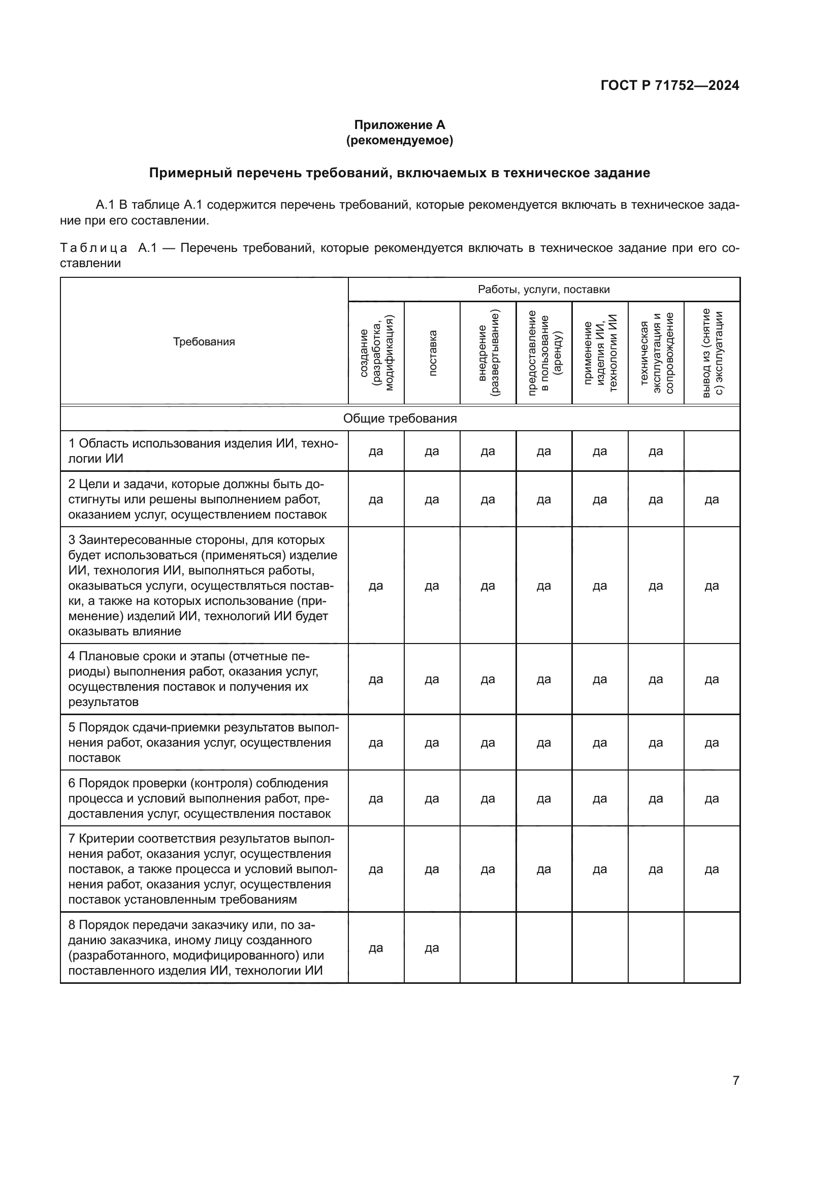 Область применения: | Настоящий стандарт устанавливает требования к структуре и содержанию технического задания, определяющего потребности заказчика в области искусственного интеллекта (ИИ), в том числе определяет состав рекомендованных для включения в техническое задание требований к результатам работ, услуг, поставок, а также, при необходимости, к процессу выполнения указанных работ, услуг, поставок, порядку их контроля и приемки |