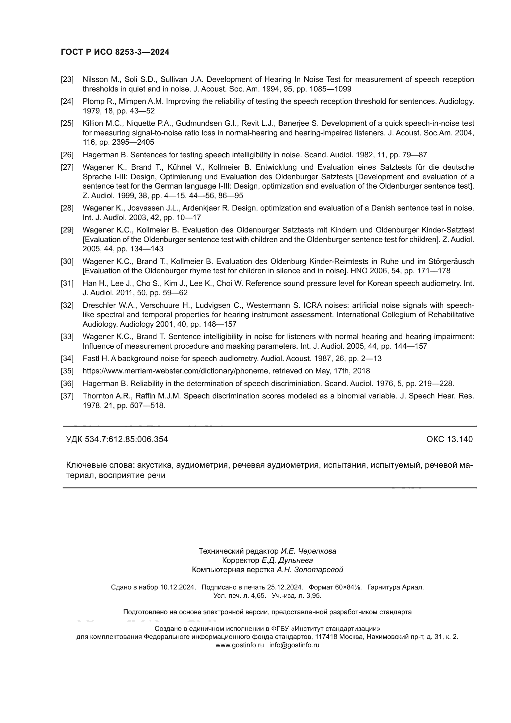 | Область применения: | Настоящий стандарт устанавливает основные методы испытаний на восприятие речи в различных аудиологических приложениях. Для обеспечения минимально необходимых требований к точности и сопоставимости результатов испытаний, включая испытания на восприятие речи на разных языках, настоящий стандарт устанавливает требования к составу и валидации применяемого в испытаниях речевого материала, но не устанавливает требований к его содержанию. Настоящий стандарт устанавливает способы определения, получения и представления нормальных уровней разборчивости речевого сигнала. Методы, установленные настоящим стандартом, предусматривают предъявление записей речевого материала через преобразователь, которым может быть головной телефон, костный вибратор или громкоговоритель. Описаны способы использования маскирующего шума для контралатерального уха и применения конкурирующего звука. Для некоторых классов испытуемых, например детей, методы, установленные настоящим стандартом, могут потребовать модификаций, которые, однако, в настоящем стандарте не рассматриваются. Настоящий стандарт не распространяется на специальные испытания, такие как определение направления прихода звука или дихотическое прослушивание |